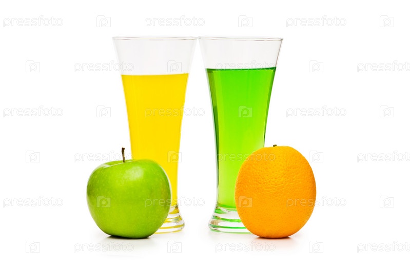 Апельсиновый и яблочный коктейли на белом фоне