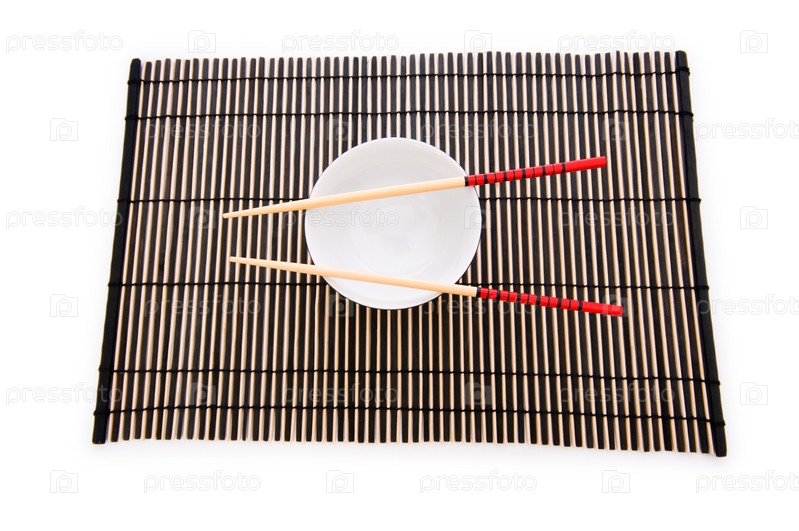 Палочки и тарелка на бамбуковом коврике