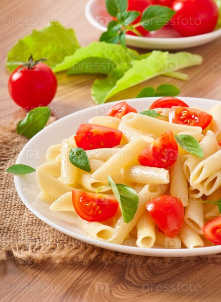 Салат с пастой, помидорами черри и свежими листьями базилика