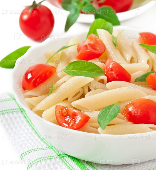 Салат с макаронами, помидорами черри и свежим базиликом