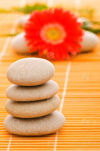 Пирамида из гальки и красная гербера крупным планом