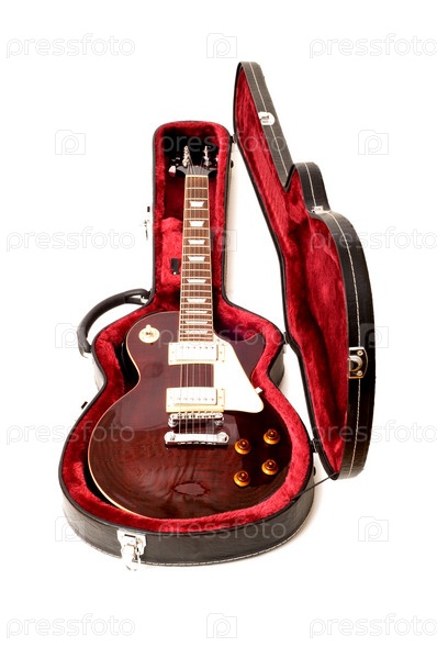 Гитара в открытом футляре на белом фоне