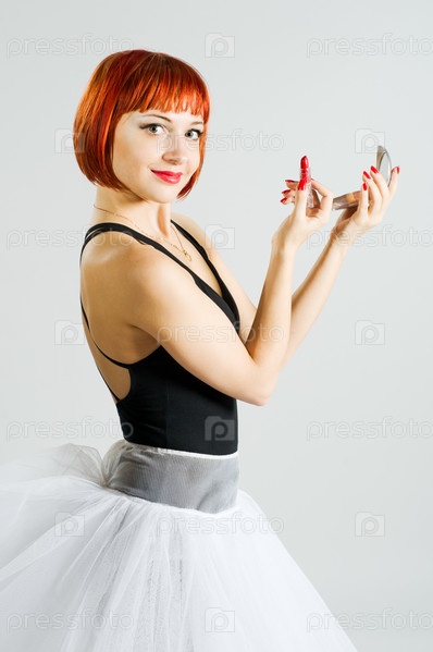 Красивая рыжеволосая девушка в балетной пачке поправляет макияж