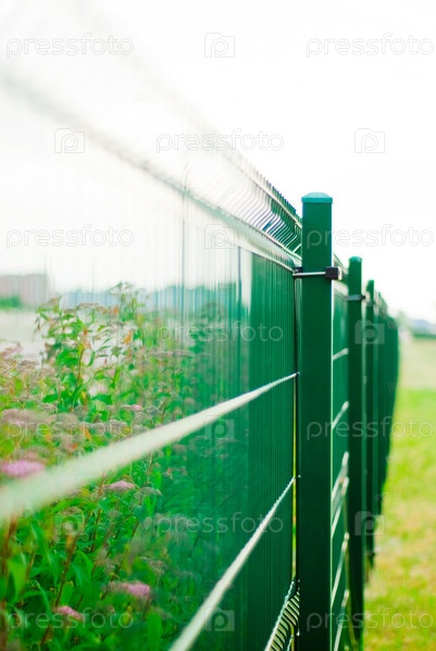 Зеленая металлическая ограда в саду