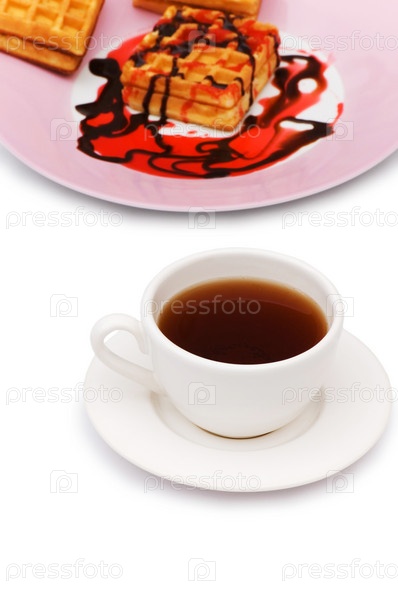 Чай и бельгийские вафли на белом фоне