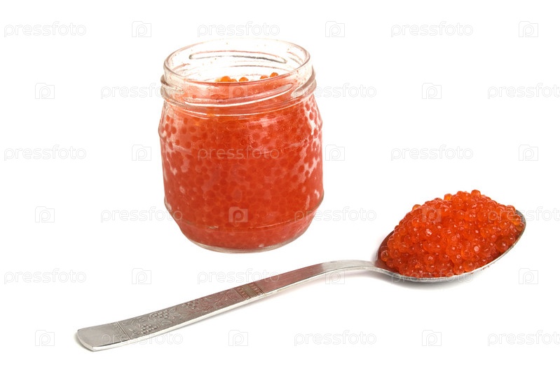 Банка и ложка с красной икрой на белом фоне