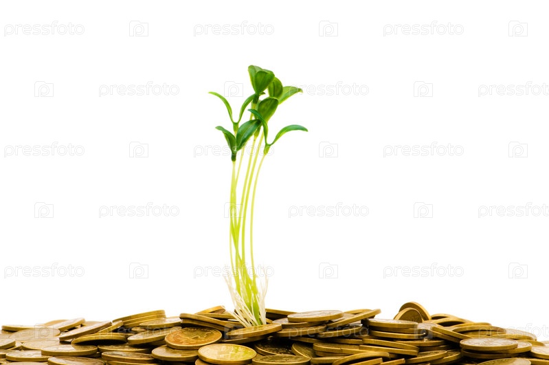 Зеленое растение, растущее из кучи монет