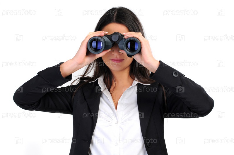 Привлекательная женщина с биноклем, изолированная на белом фоне