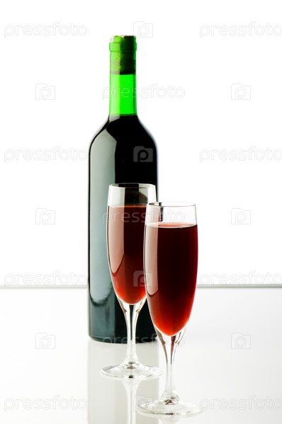 Бутылка вина и бокалы на белом фоне