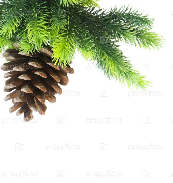 Еловая ветка с шишкой на белом фоне