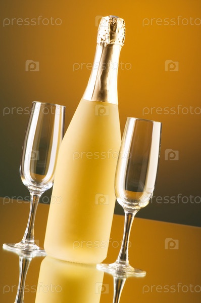 Бутылка игристого вина и два пустых бокала