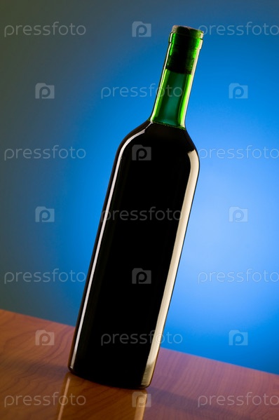 Бутылка вина на фоне голубой стены