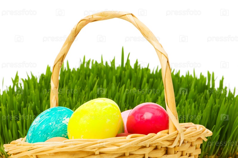 Крашеные яйца в корзинке на фоне травы