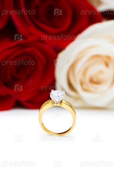 Обручальное кольцо на фоне красных и белых роз