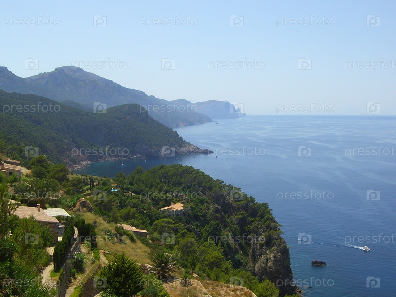 Горный пейзаж, вид на деревню Banyalbufar, северное побережье острова Мальорка, Средиземное море, Испания