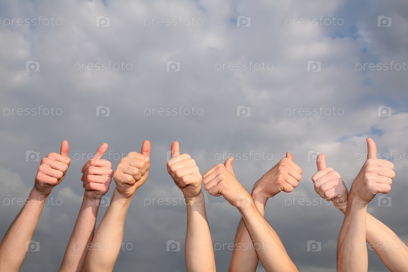 Руки с поднятыми большими пальцами на фоне облачного неба