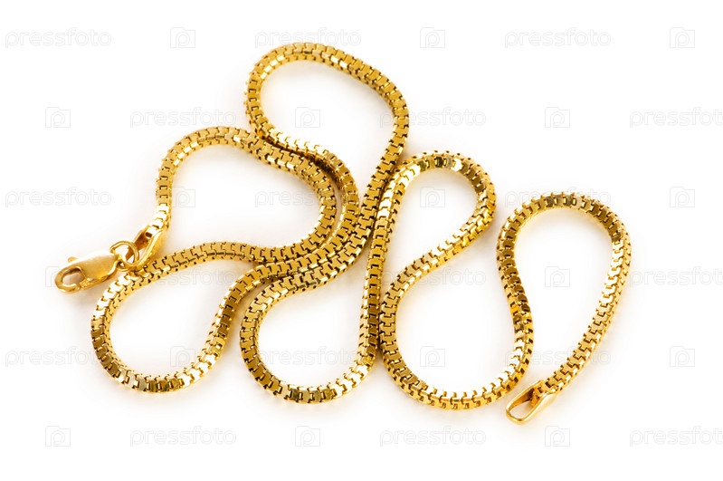 Длинная золотая цепочка на белом фоне
