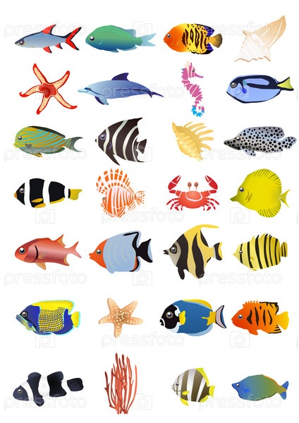Различные подводные обитатели на белом фоне