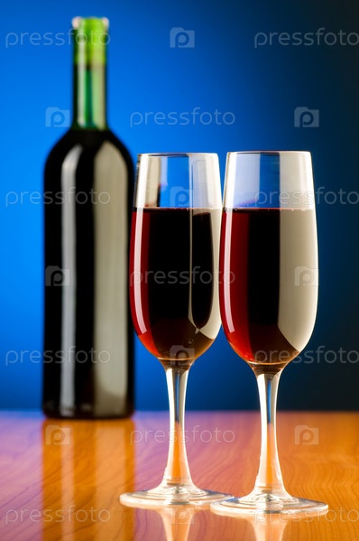 Два бокала вина на фоне винной бутылки