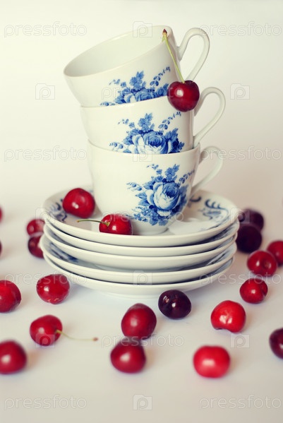 Чашки с блюдцами и вишни на белом фоне
