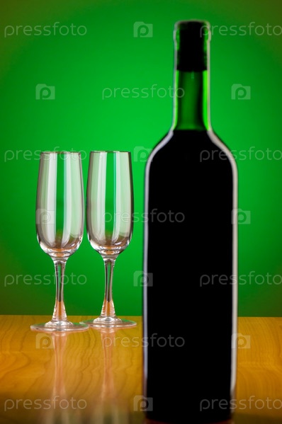 Бутылка вина и два бокала на зеленом фоне