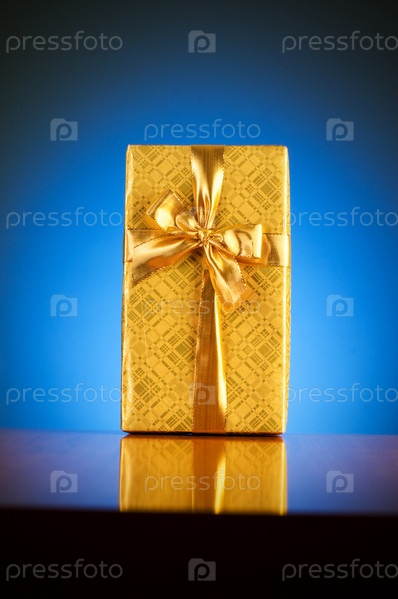 Подарок в золотой коробке на голубом фоне