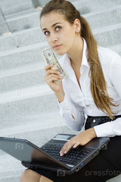 Деловая девушка с ноутбуком и долларами в руке