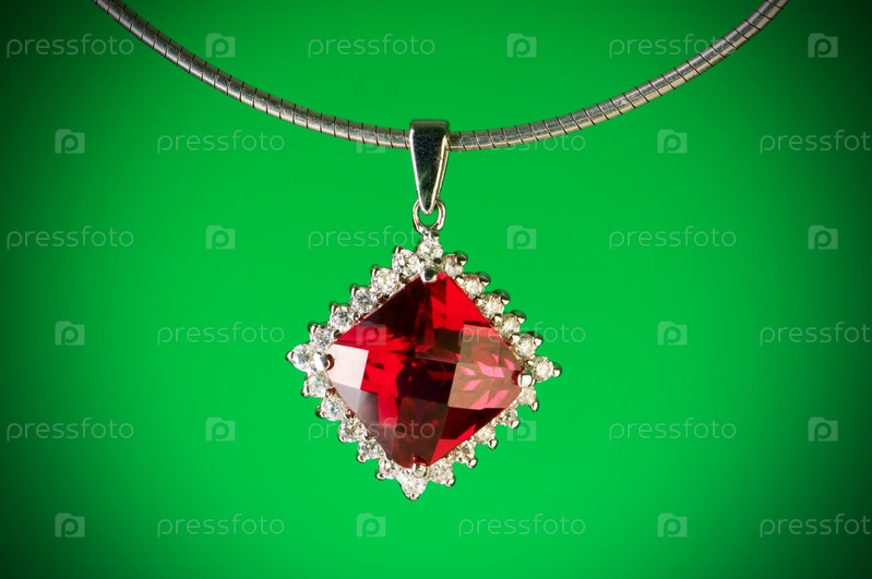 Кулон с красным камнем на зеленом фоне