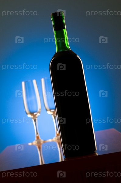 Бутылка вина и бокалы на голубом фоне