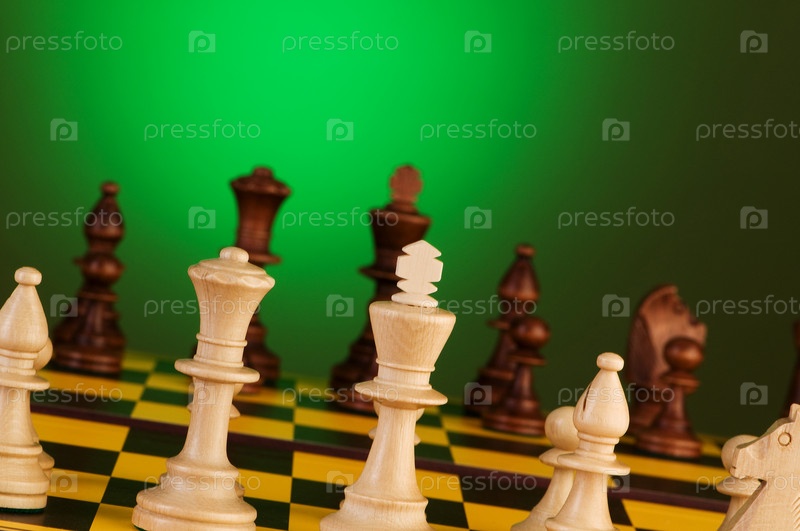 Доска с шахматными фигурами на зеленом фоне