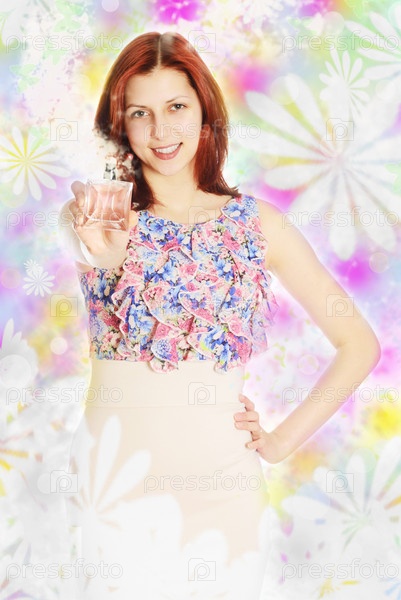 Девушка в цветочном платье держит бутылек духов