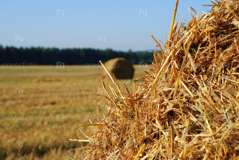 Часть стога сена крупным планом на фоне размытого поля