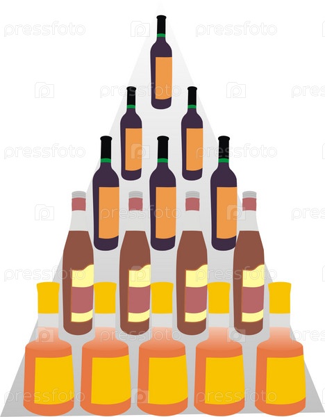 Много бутылок с алкоголем, расставленных в форме треугольника