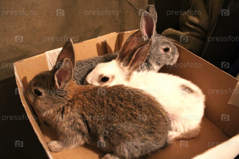 Выводок из трех кроликов в коробке