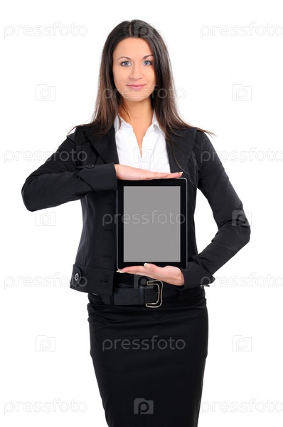 Бизнес-леди с планшетныйм компьютером на белом фоне