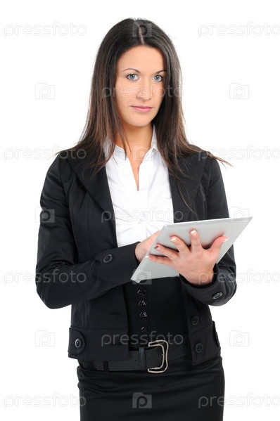 Бизнес-леди с планшетныйм компьютером на белом фоне
