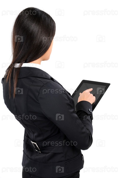 Бизнес-леди с планшетныйм компьютером на белом фоне