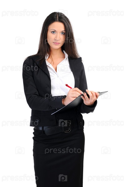Портрет деловой женщины с документами на белом фоне