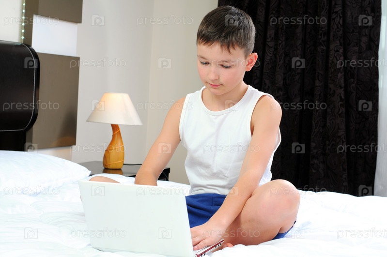 Мальчик с ноутбуком в постели, счастливое время