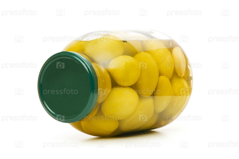 Банка с маринованными помидорами на белом фоне