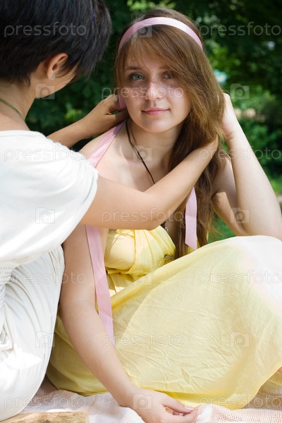 Молодая девушка вплетает ленту в волосы подруги