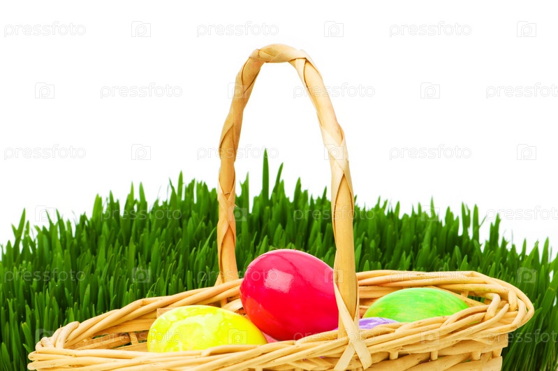Пасхальная корзина с яйцами на белом фоне
