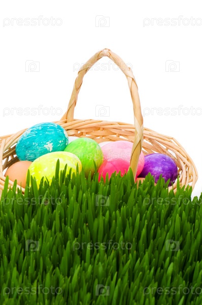 Пасхальная корзина с яйцами спрятана в траве на белом фоне