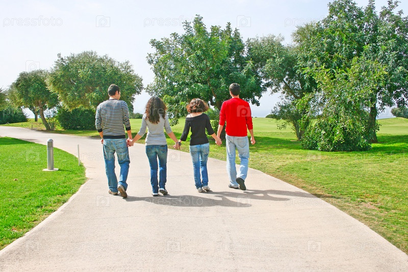Четыре подростка идут за руки по дороге
