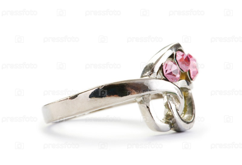 Серебряное колечко с розовыми камнями на белом фоне