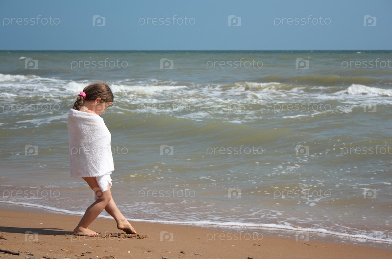 Маленькая девочка в белом полотенце стоит на берегу моря