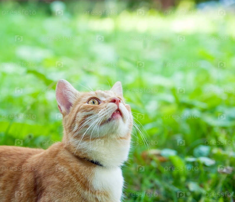 Рыжий котенок на зеленой лужайке