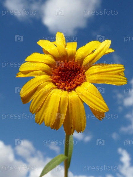 Ярко-желтая календула на фоне голубого неба