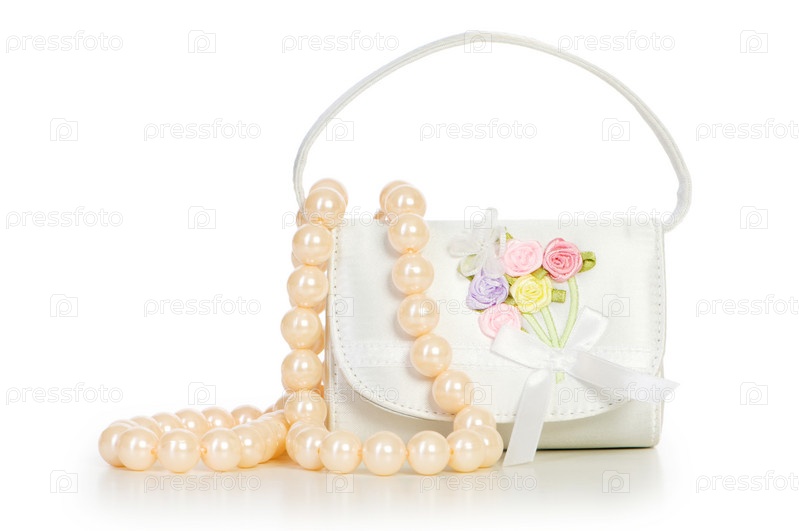 Жемчужное ожерелье и белая сумочка на белом фоне