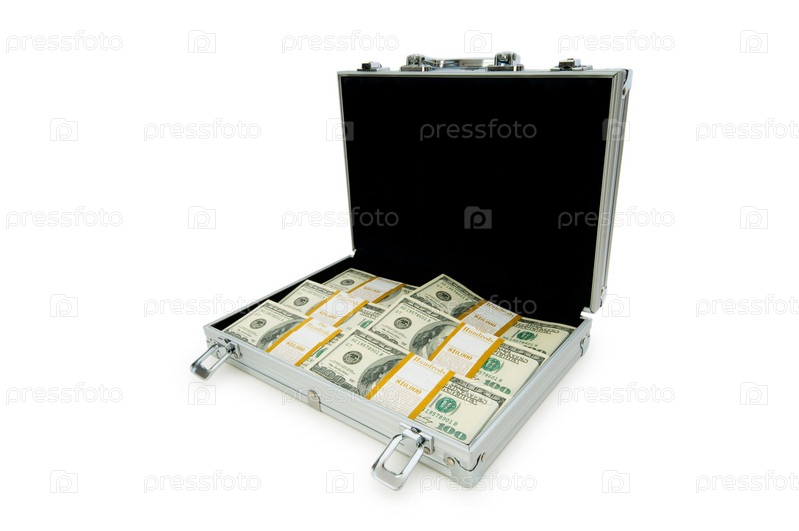 Деньги в чемодане изолированы на белом
